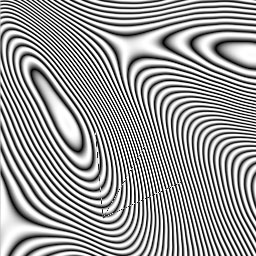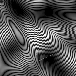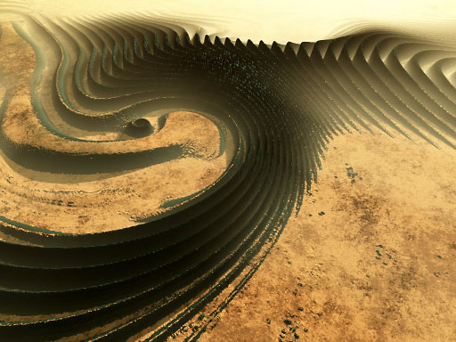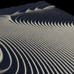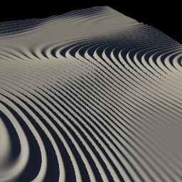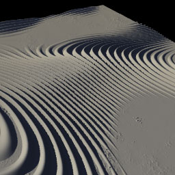 Wichtig ist, dass man das grün markierte DropDown von 'f(x)=Noise' auf 'f(x)=sin(x+Noise)' stellt. Damit kommt man zu völlig anderen, aber recht interessanten Terraintypen. Um den Typ in der Abbildung oben zu erhalten, habe ich die Werte für Anstieg1 und Fractal Dimension leicht veringert und noch etwas mit Anstieg2 gespielt. Dann muß man noch ein paar mal auf Neue Berechnung klicken, bis man etwas hat, von dem man denkt, dass es als Terrain gut aussieht.