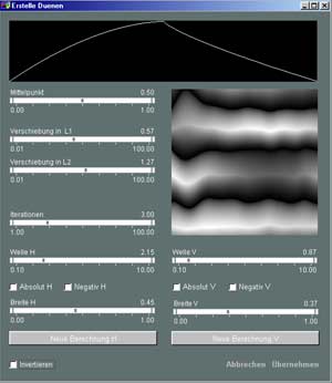 Bei allen Making Of's zeige ich nur die Schritte, die zu einem ähnlichen Terrain führen, wie im Bild oben gezeigt. Der Grund ist einfach: Als ich diese Bilder gemacht habe, hatte ich noch nicht vor dieses Tut zu erstellen, und hab von den Schritten halt keine Screenshots ;o) Außerdem sollen die drei Making Of's hauptsächlich zeigen, was man so machen kann, also nur eine Inspiration sein. D.h. es ist unter Umständen noch etwas Rumprobieren nötig...