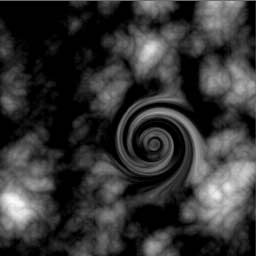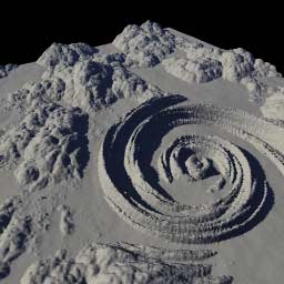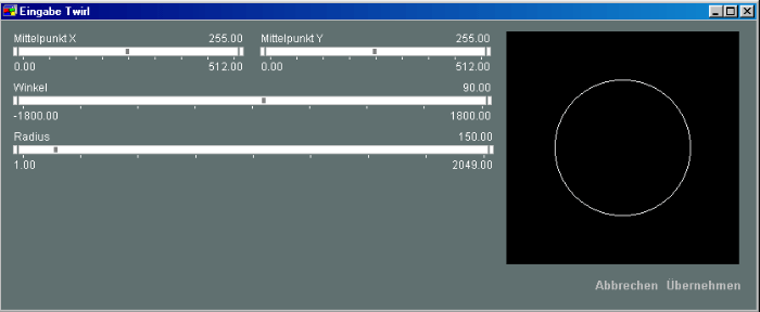 Die Funktion [Bild/Twirl] verzerrt einen kreisförmigen Bereich des Terrains. Mit den Reglern "Mittelpunkt x" und "Mittelpunkt y" kann man diesen Bereich im Terrain positionieren und der Regler "Radius" erlaubt es die Größe des Bereiches einzustellen.