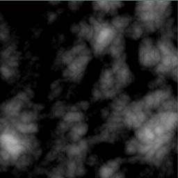 Zuerst ein Terrain mit der Funktion [Füllen/Noise] füllen. Ich habe mich für die "Blumenkohlberge" entschieden. Wie man die bekommt steht »hier«. Der Höhenbereich war hierbei auf den Grundeinstellungen (0,000-1,000) belassen. Um den Anteil der flachen Ebenen zu erhöhen habe ich das erhaltene Terrain mit [Bild/HelligkeitKontrast] noch etwas dunkler gemacht. Durch diese Maßnahme werden die schwarzen Bereiche vergrößert, die die Höhe null haben.