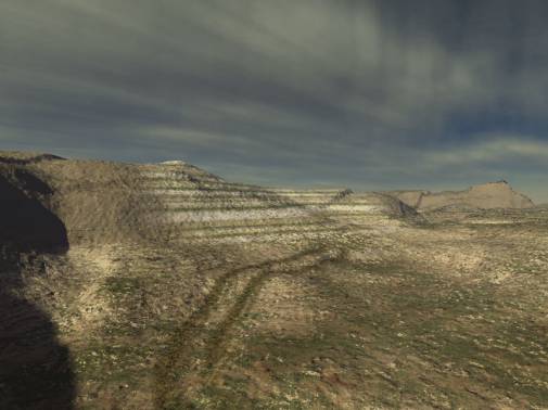 Ich habe für dieses Bild einfach ein generiertes Terrain verwendet. Dann erstellte ich irgendeine Surface Map und suchte eine Kameraeinstellung, die mir gefiel. Wenn Du das Beispiel nachvollziehen willst, dann gehe einfach ähnlich und nimm eine Surface Map die Dir gefällt.