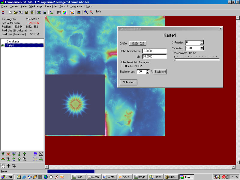 Das gewünschte Hintergrund-Terrain (2049) in TF2 (Terraformer2 von Tobias Weigel) öffnen und dann eine neue Karte erstellen. Mit der Funktion "Kartenfilter - Karte importieren" das Artefakt-Terrain (1025) laden und dann mit Hilfe der Karteneigenschaften in die gewünschte Position schieben! Um es dann mit dem Hintergrund zu kombinieren, den Mischmodus auf "Höchster" stellen. Jetzt können noch ein paar Einstellungen an den Höhen der Terrains vorgenommen werden. Wichtig: Die Koordinaten des Artefakt-Terrains aufschreiben, weil man die später zum Erstellen der Distribution Map braucht. Hintergrund-Terrain: Das Hintergrund-Terrain wurde mit Terrabrush (von Funker) erstellt, in TF2 importiert und dann mit "Fractalvergrößerung" auf 2049 hochgerechnet(die aktuelle Version von Terrabrush kann nur Terrains von 1025*1025 Größe erstellen). Dann wurde eine neue Karte erstellt und mit der Funktion "Landschaftsgenerator - Benutzerdefinierte Struktur" mit einem Terrain gefüllt. Auf dieses wurde dann noch die Funktion Umformungskurven "Krater" angewendet, bevor es mit dem Terrabrush-Terrain kombiniert wurde.