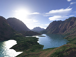 Es bleibt immer noch so viel zu lernen! Die Einstellungen für colles Wasser, schicke Terrains und einen schicken Himmel gleichzeitig in einem Bild haben. Außerdem kommt ja bald Terragen 2 und vielleicht sollte ich WorldMachine registrieren?! Und was ist mit TerraPainter, Campath und TerraAnim...