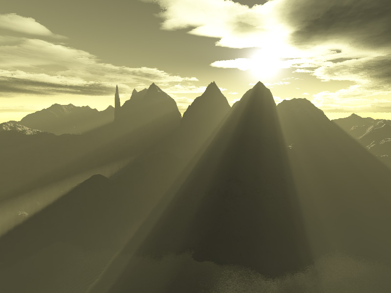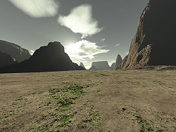 So, Terragen ist frisch runtergeladen, vielleicht auch schon einen Terraingenerator und los geht's! Ich erinnere mich noch gut an diese Zeit. Einfach mal an allen Knöpfen rumspielen, wild die Kamera verschieben und viel mit dem Sky experiementieren.Surface, was ist das? ...und so weiter. Damals war ich der Meinung, dass ich mindestens 3-4 absolut veröffentlichungswürdige Bilder pro Stunde(!) produzieren könnte. Ganz typisch für diese Phase finde ich inzwischen, dass man zwar viele tolle Sachen machen kann und auch macht, aber eigentlich nicht weiß, was man tut. Am deutlichsten äußert sich das darin, dass man nichts reproduzieren kann, von dem was man gemacht hat. Man sichert sich seine Erfahrungen also nicht. Wie auch, es ist ja alles neu, und man kann das neu gelernte nicht mit bekanntem vernetzen! Meine Bilder bewegten sich damals auf dem typischen Anfängerniveau: